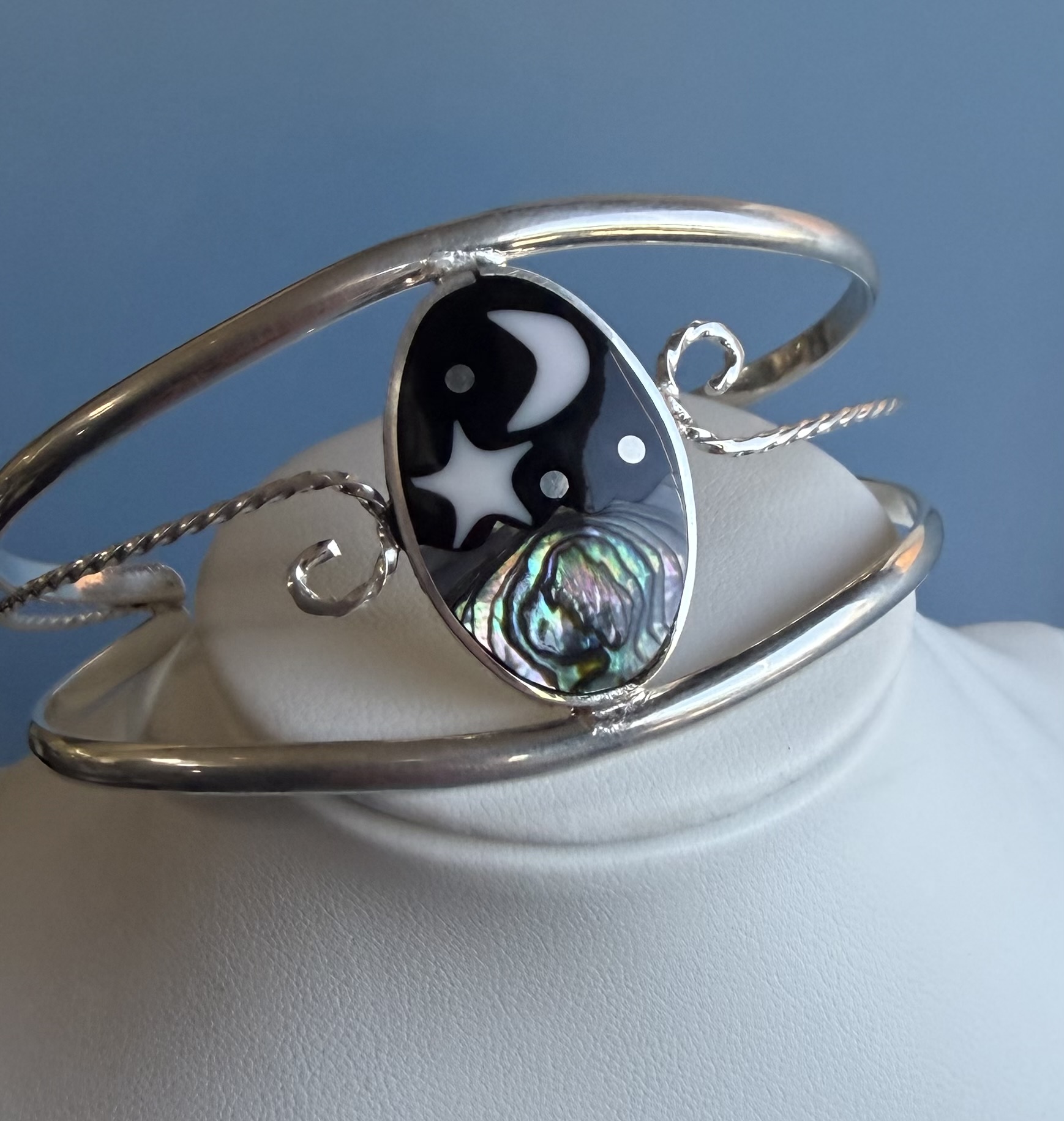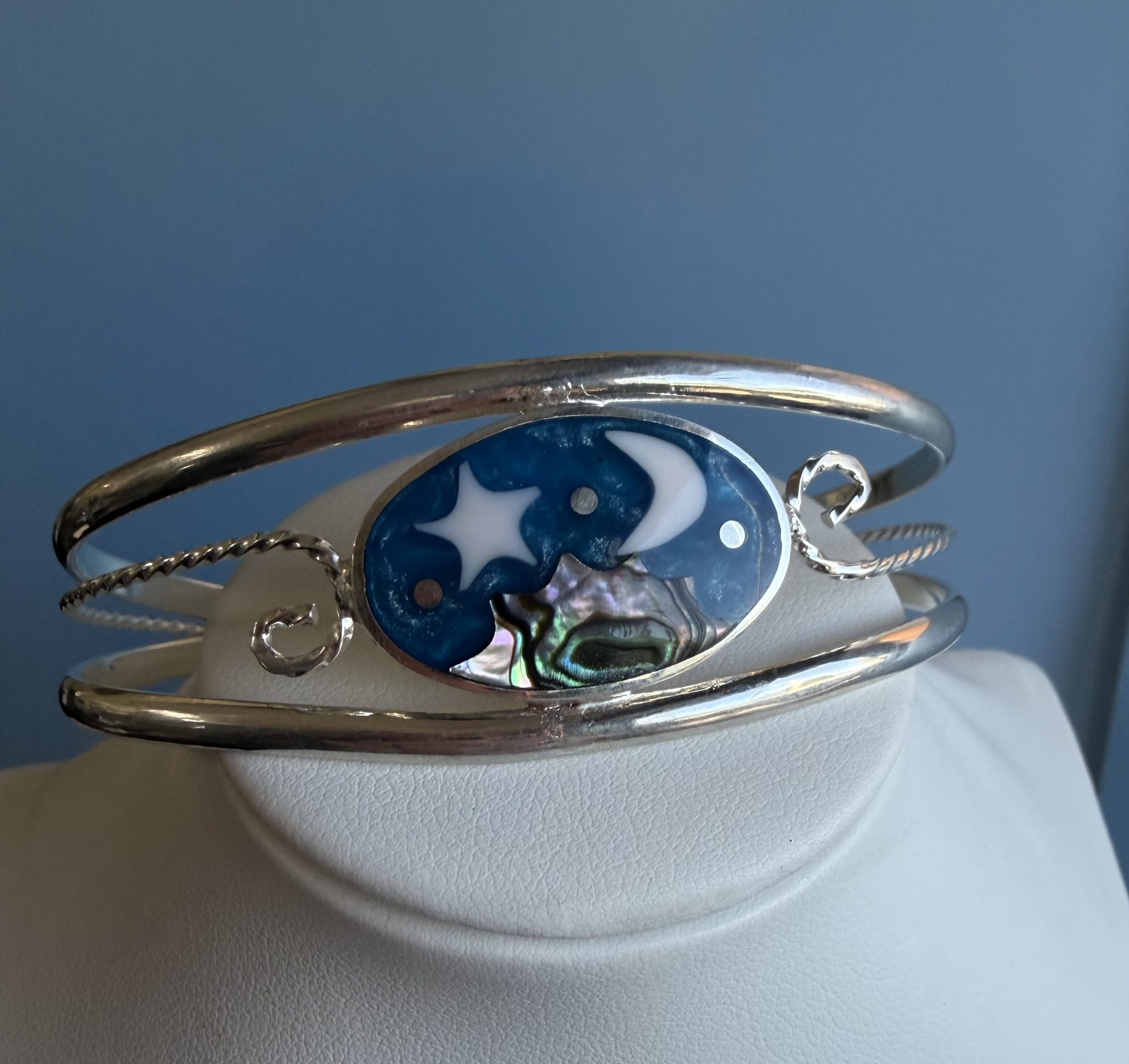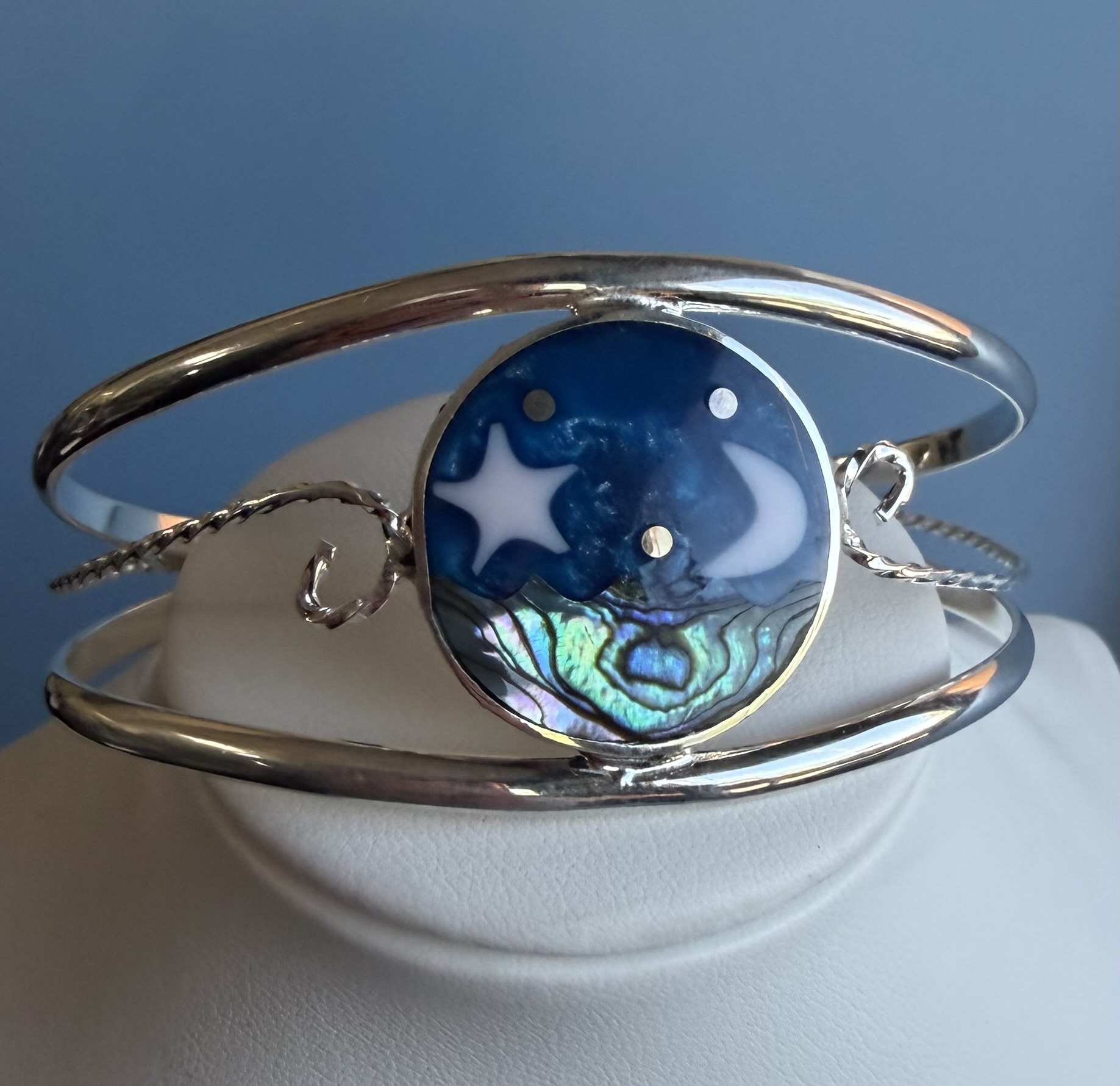 This collection features handcrafted cuff bracelets from Mexico, each designed with celestial elements including crescent moons, stars, and planetary details. The designs are set against rich enamel tones and finished with natural abalone shell, creating subtle movement and light with every wear.