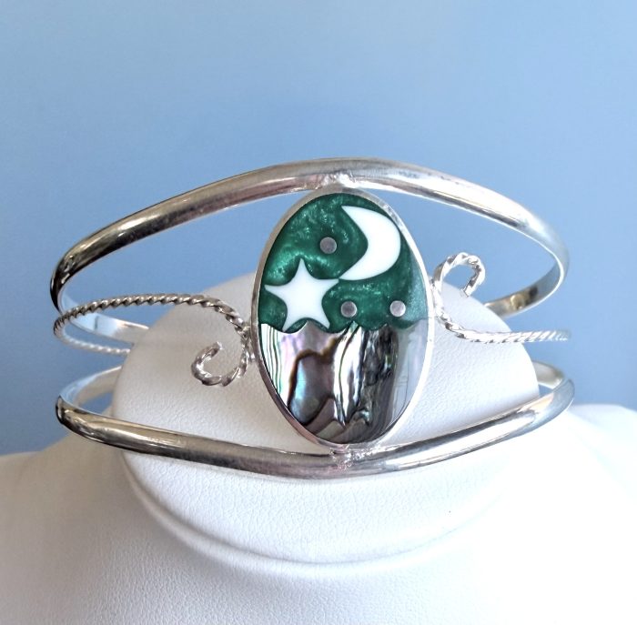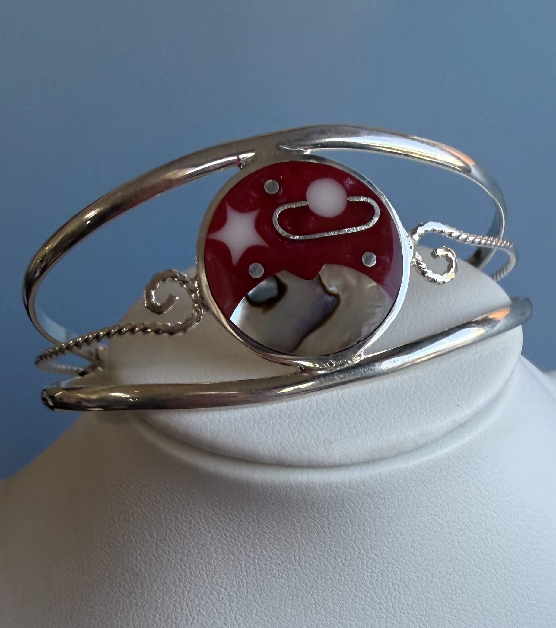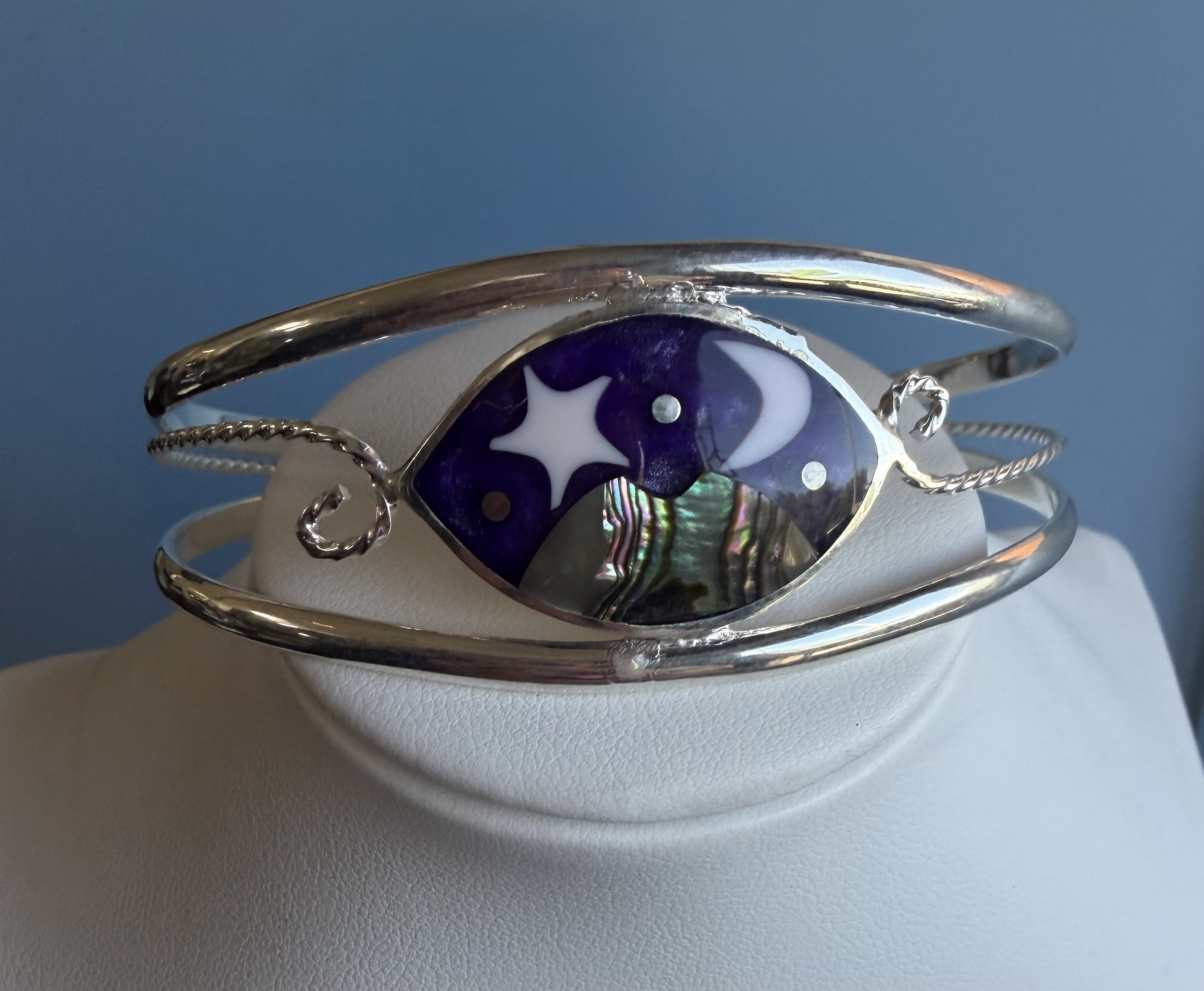 This collection features handcrafted cuff bracelets from Mexico, each designed with celestial elements including crescent moons, stars, and planetary details. The designs are set against rich enamel tones and finished with natural abalone shell, creating subtle movement and light with every wear.